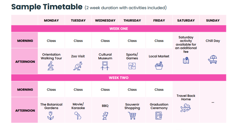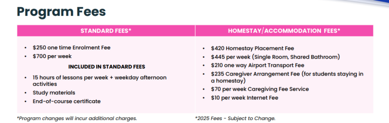 1週間あたりの授業・アクティビティ費用は$700、ホームステイは$445/週です。