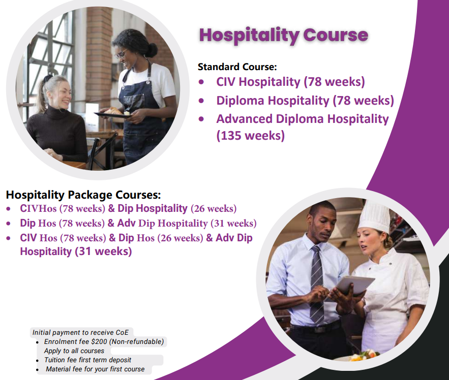 → 3か月ごと約A$2,300 × 9回の分納可(教材・制服は別途) - 実務中心:全コースにWork Placement(現場実習)360時間