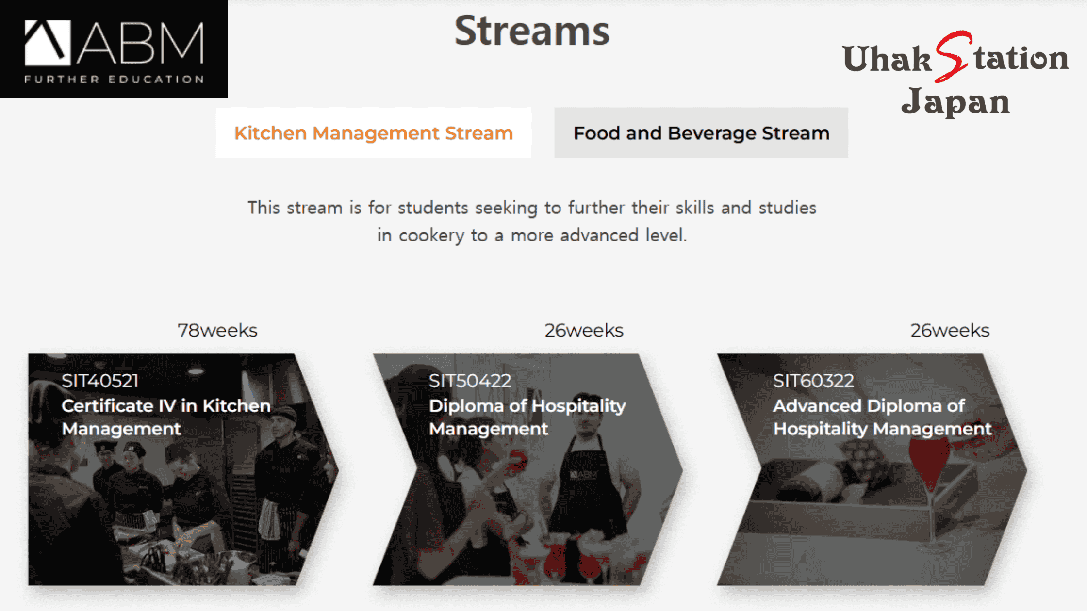 ABM Further Education は、Cookery(調理)に加えて Hospitality Management(運営・管理) まで実践中心で学べる教育機関です。