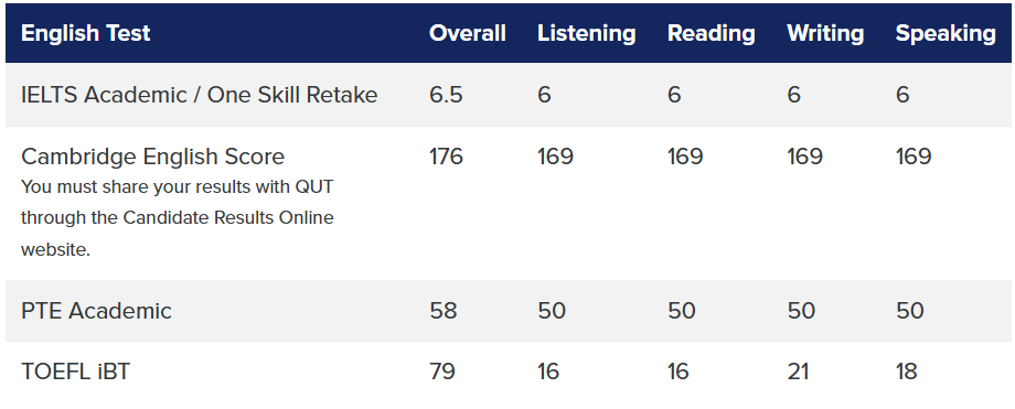 国際学生は IELTS 総合6.5(各セクション6.0以上) の英語力が必要です。TOEFL iBT 79 点など同等スコアでも可。スコアが足りない場合は、QUT 付属の語学コース経由での条件付き入学も検討できます。